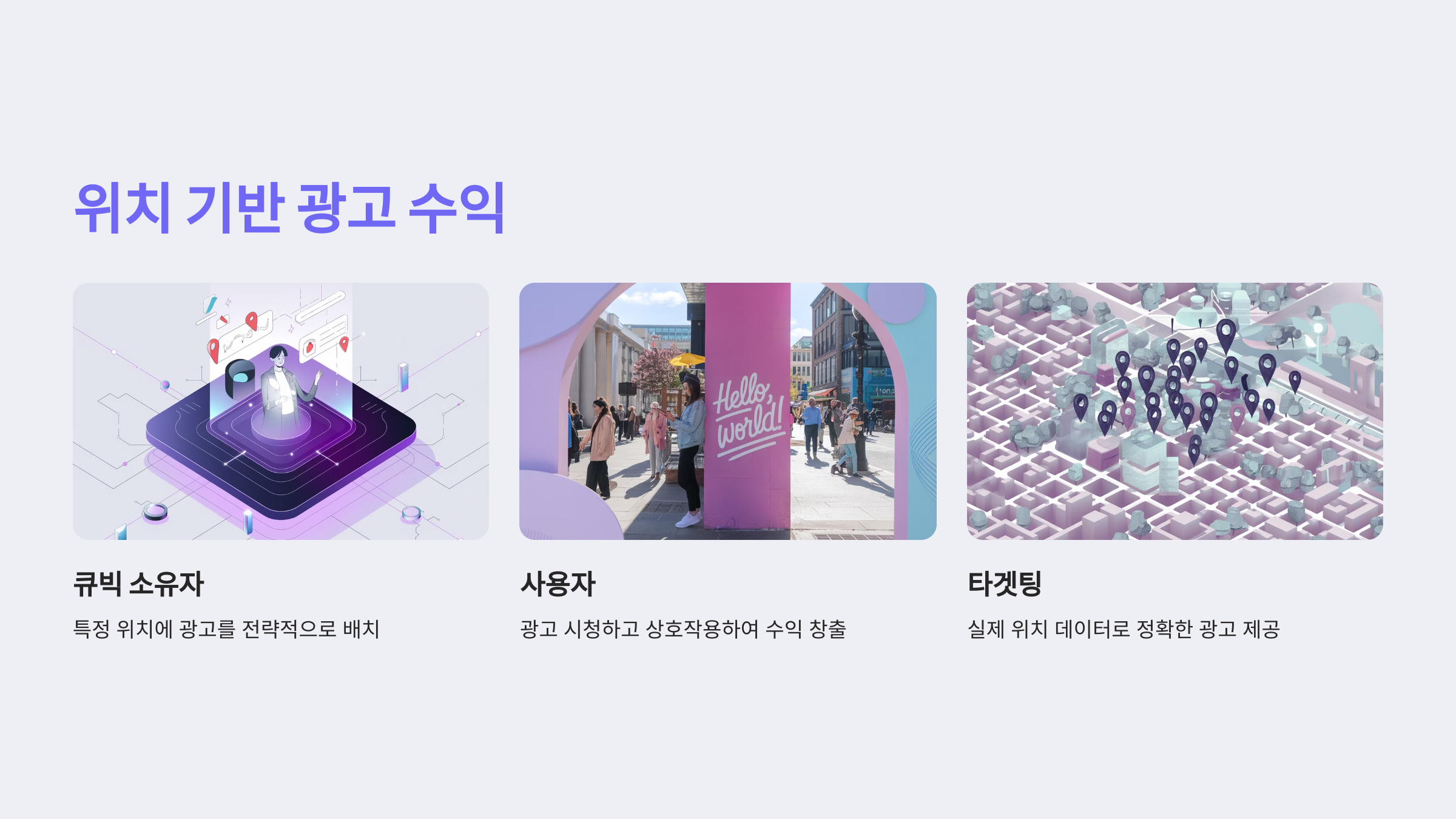 KEES 큐빅은 이러한 메타버스의 개념을 한 단계 발전시켜, 현실 세계의 특정 위치와 연결된 디지털 자산으로 작용합니다. 각 큐빅은 실제 위치를 기반으로 하여, 해당 위치에서 발생하는 다양한 광고 수익을 소유자에게 제공할 수 있는 기회를 만들어줍니다. 즉, KEES 큐빅은 현실 세계와 메타버스를 연결하는 다리 역할을 하며, 이를 통해 큐빅 소유자는 보다 현실적인 광고 수익을 기대할 수 있습니다.