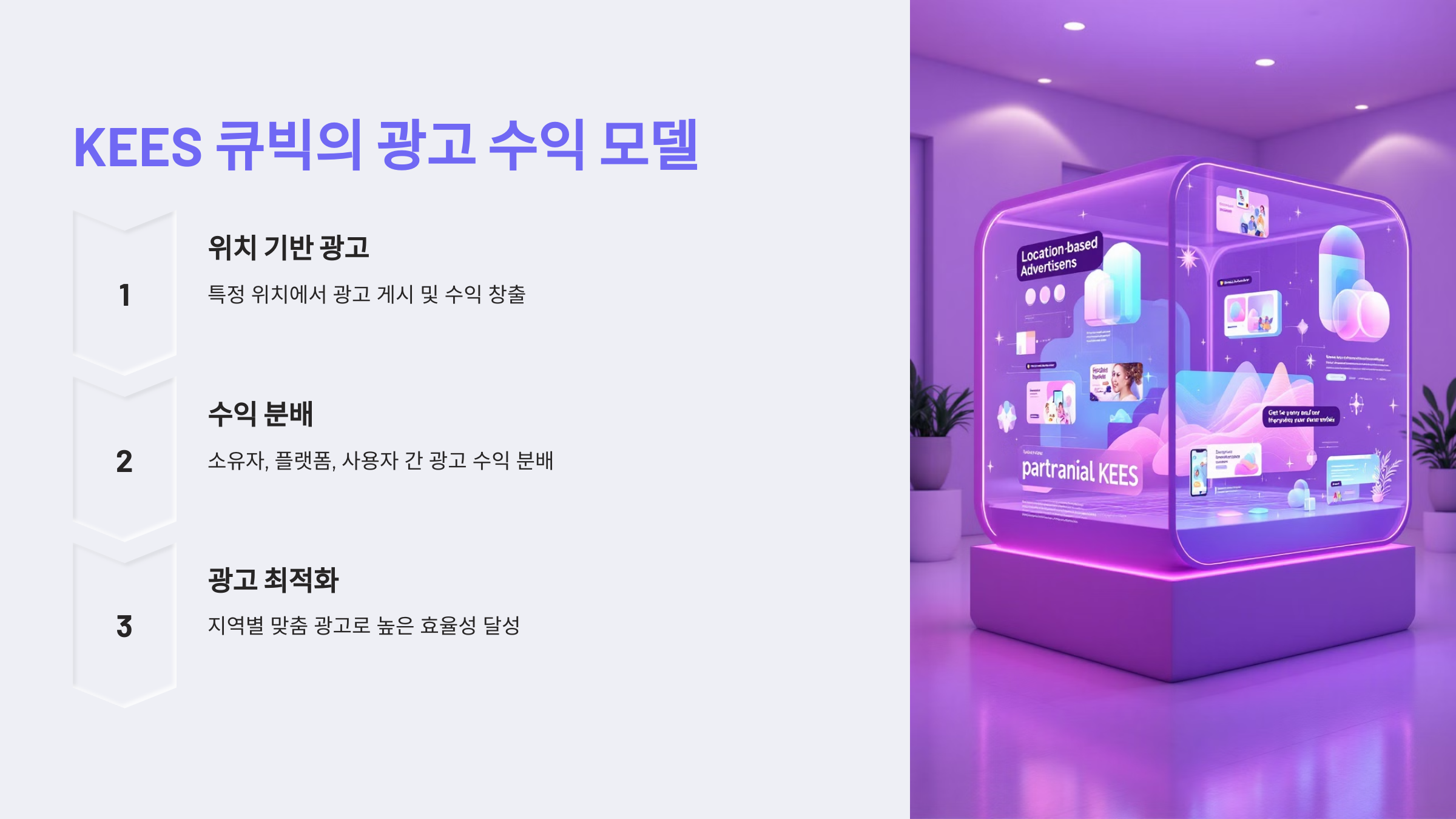 메타버스에서 광고는 가상 공간 내에서 사용자의 경험에 자연스럽게 녹아들 수 있는 강력한 도구입니다. KEES 큐빅은 메타버스의 광고 수익 모델과 유사한 방식으로, 소유자가 특정 위치에서 광고를 운영하여 지속적인 수익을 창출할 수 있게 합니다.