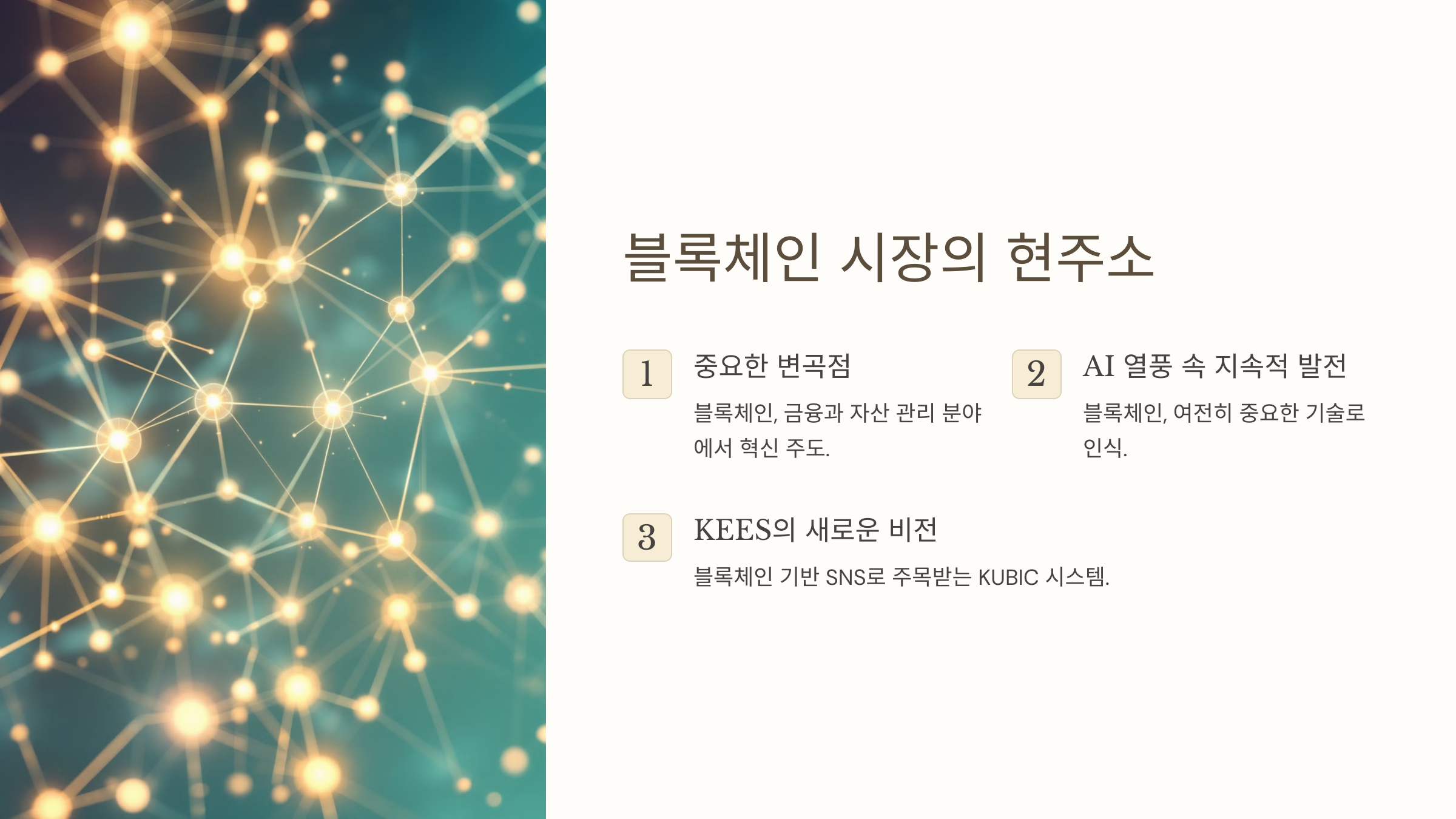 현재 블록체인 시장은 중요한 변곡점에 서 있습니다. AI 열풍 속에서도 블록체인은 여전히 금융과 자산 관리 분야에서 혁신을 이끌고 있죠. 이런 상황에서 KEES가 제시하는 새로운 비전은 매우 흥미롭습니다.
