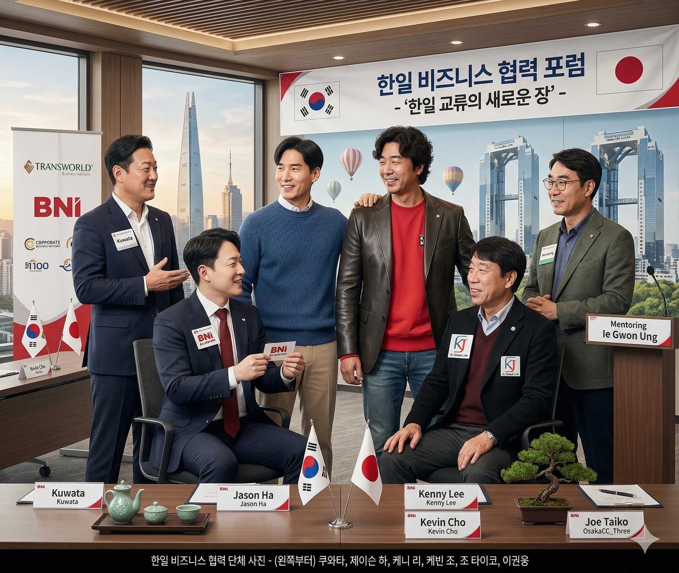 BNI 코리아 D100 챕터의 하재웅 소장(레버리지연구소), 조영빈 디렉터(어니스톤), 이상혁 대표, 이권웅 대표와 일본 BNI 오사카 챕터 소속 Kuwata Kazushiko(구와타 가즈히코) 대표, 그리고 10년간 한일 기업 교류를 이어온 KJ 글로벌 링크의 Kevin 대표까지 — 서로 다른 전문성을 가진 한국·일본의 BNI 멤버들이 한 자리에 모였습니다.